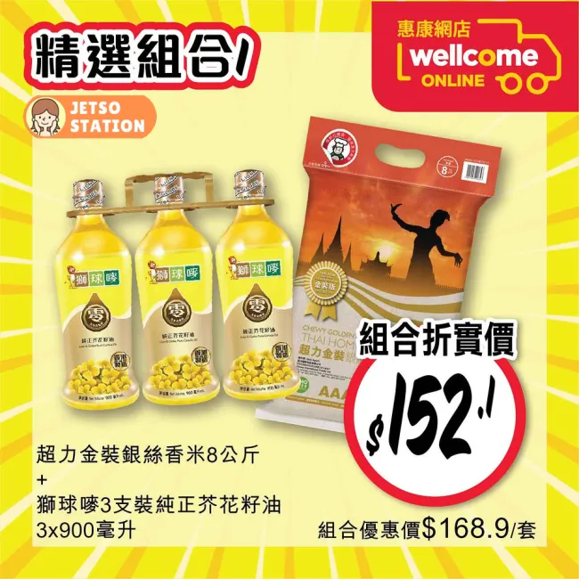 – 超力金裝銀絲香米8公斤 +獅球嘜 3支裝純正芥花籽油 3×900毫升 → 折實 $152.1/套