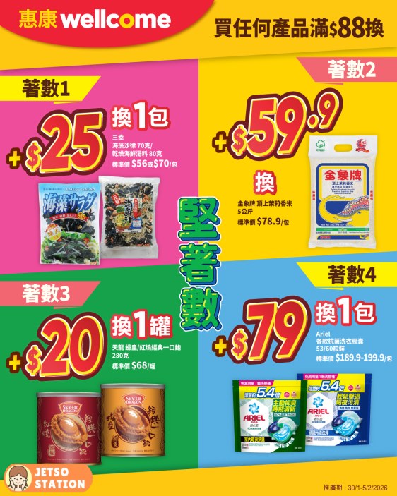 今期嚟惠康買任何產品滿$88,即享以下優惠: