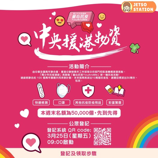 由中華全國青年聯合會、香港中聯辦青年工作部等中央部門和駐港機構牽頭推動,「青少年抗疫連線」推出新一輪抗疫包派發活動,於3月25日上午9時開放公眾登記,並於本週日 (3月27日)派出首5萬個抗疫包。