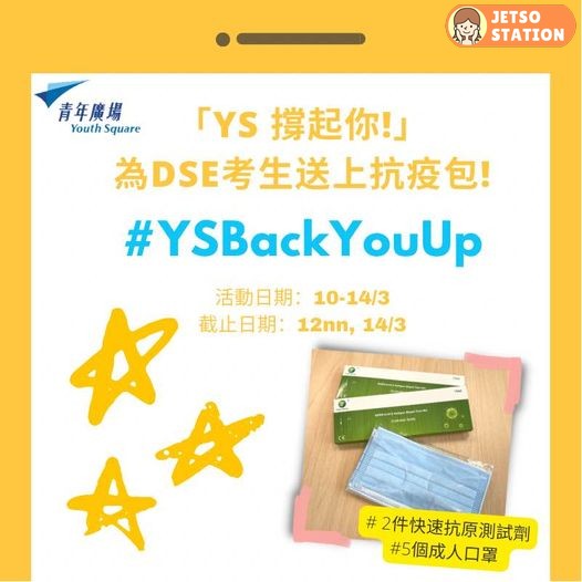 【YS撐起你 為DSE考生送上抗疫包!】應屆DSE考生除咗要應付學習模式嘅轉變,仲要忙於防疫,身心都面臨好大挑戰,正所謂 #人無事先可以做世界冠軍㗎嘛!喺呢個艱難時期,我哋特別為你哋送上一點心意同支持,希望你哋知道 #YouAreNotAlone
