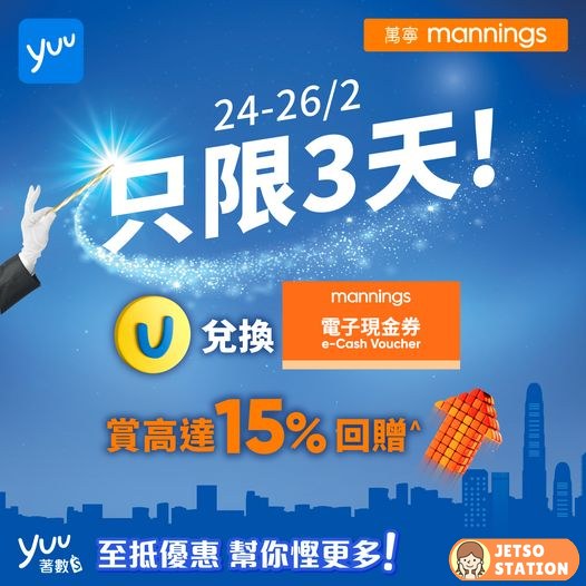 由即日起至2月26日,透過yuu App你就 可以5,500積分兌換萬寧$30電子現金券*, 或以10,400積分兌換萬寧$60電子現金券*, 相等於多賞你高達15%^回贈獎賞只限3日。